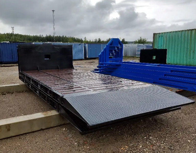 Våra maskinflak är designade för lastväxlare och klarar laster från 12–25 ton (beroende på modell). De är tillverkade i robust stål med kraftig ramkonstruktion, fasta eller fällbara ramper, omvänd kil för låga maskiner, stakhylsor (ofta 35–50 st), hjulfickor, förvaringslåda och massor av fästpunkter för säker lastsäkring.